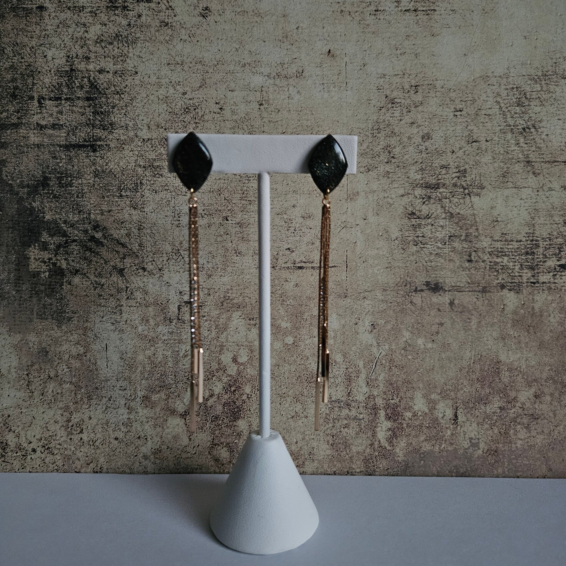 Neroli 'ruit', lange smalle glamour oorhangers, ruitvormige studs (RVS), goudkleurige franjes met zirkoontjes (PMK Cannes-humus) (RVS oorstekers)