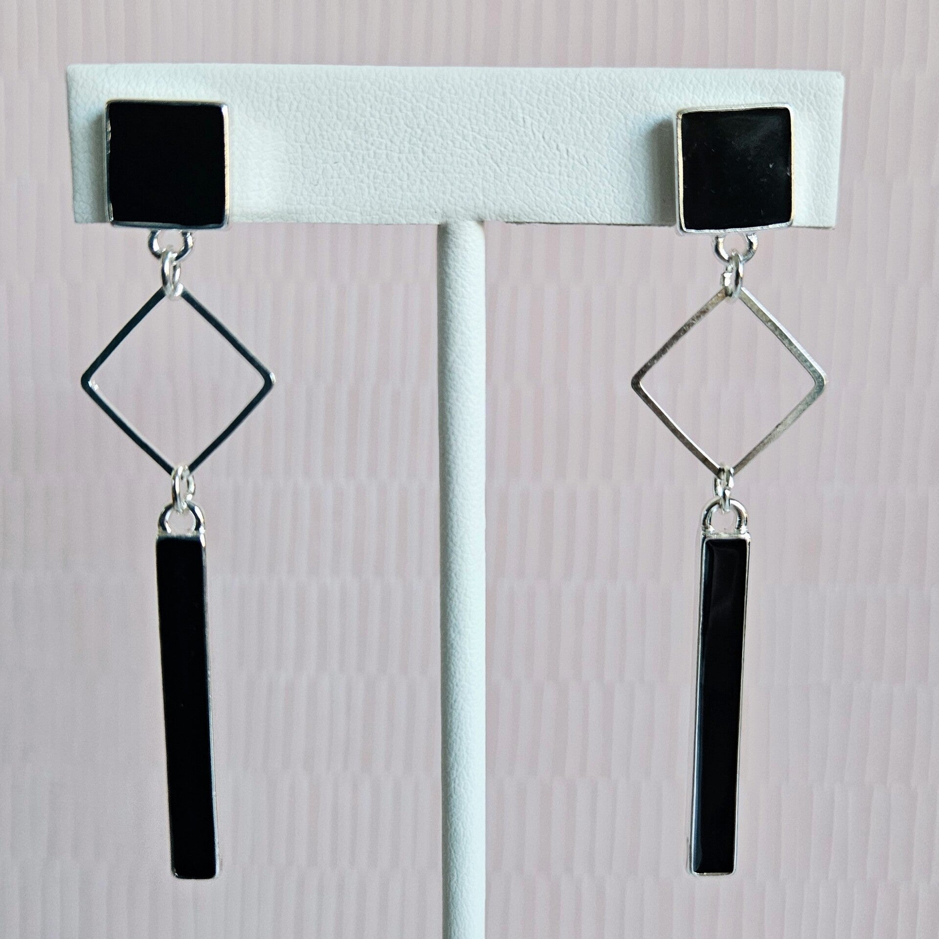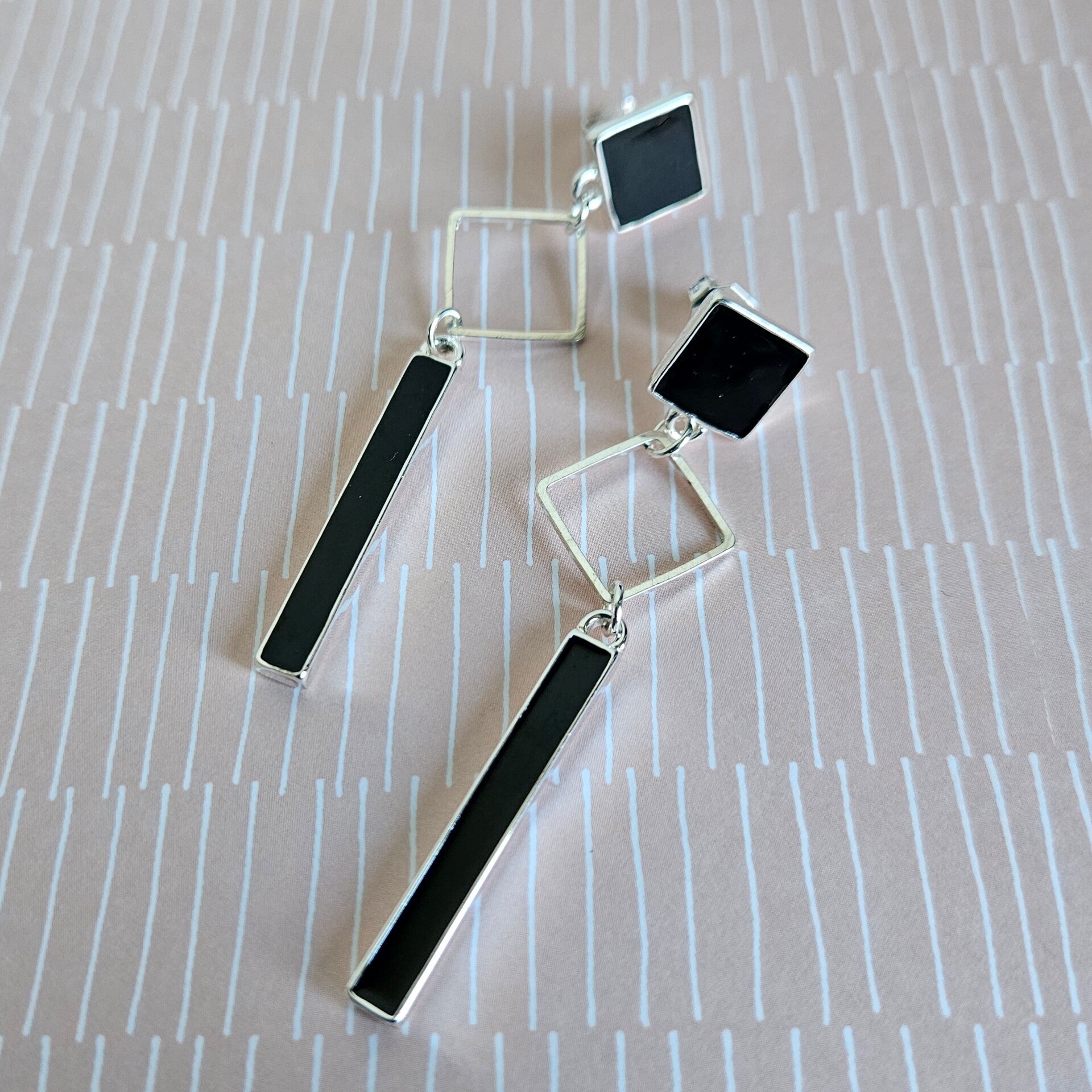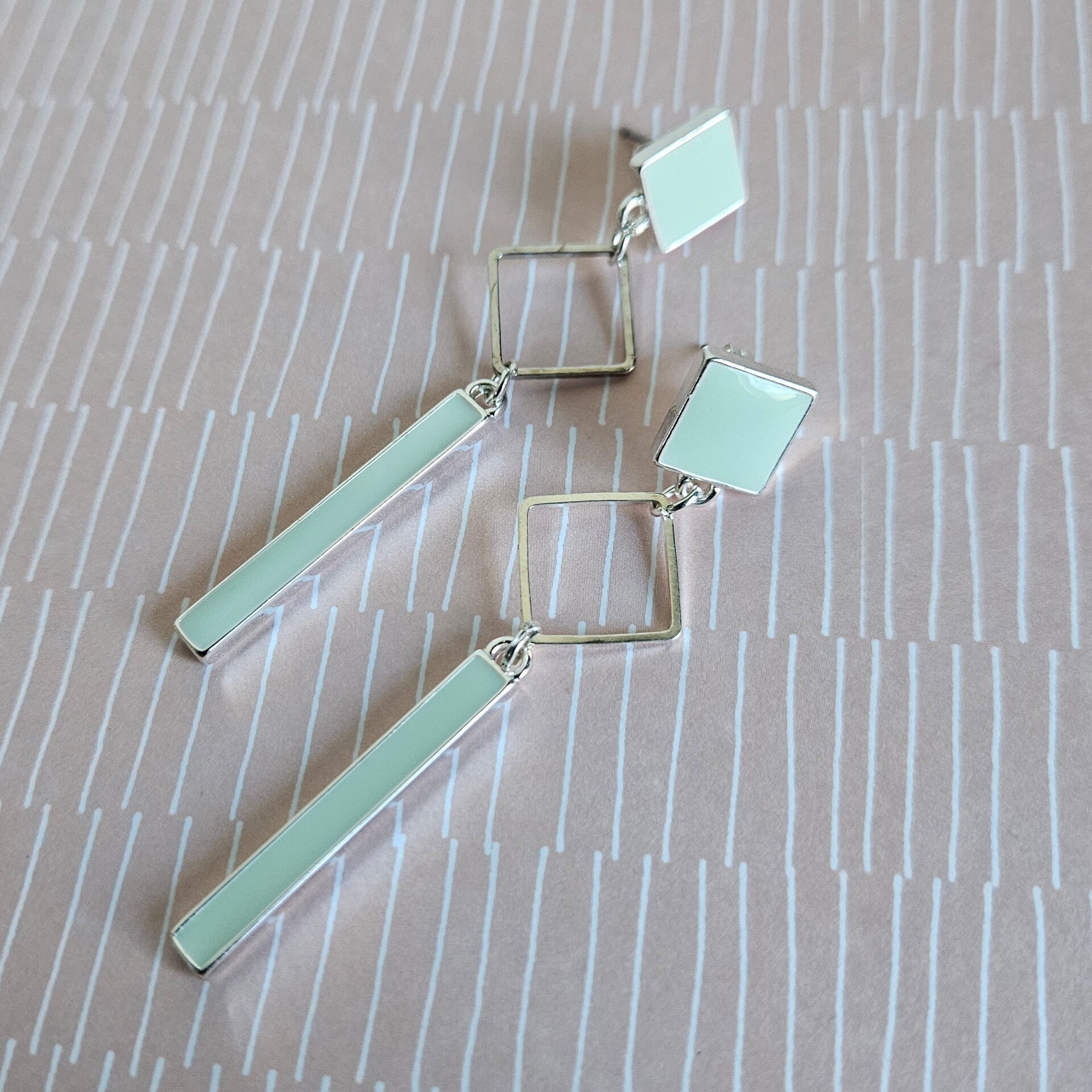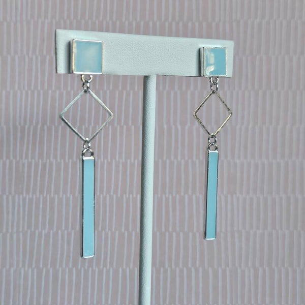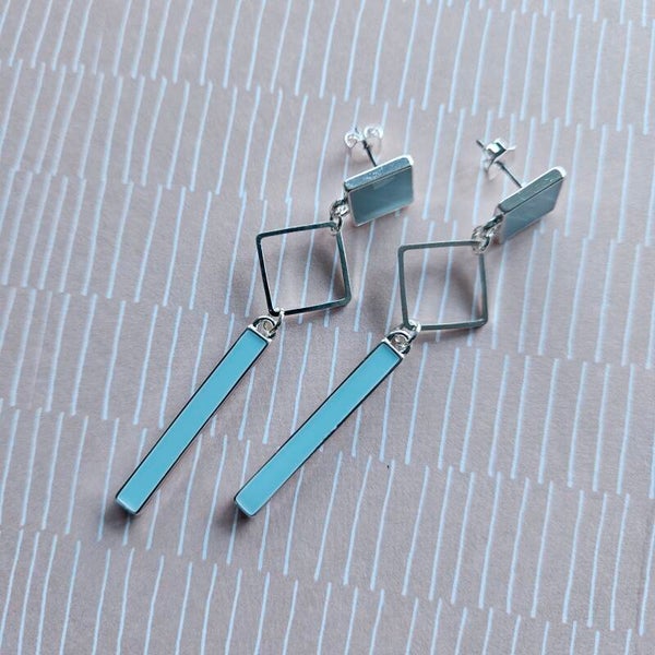 lange oorhangers met staafje, vierkante connector en vierkante stud - luxe-editie (zilver, emaille)